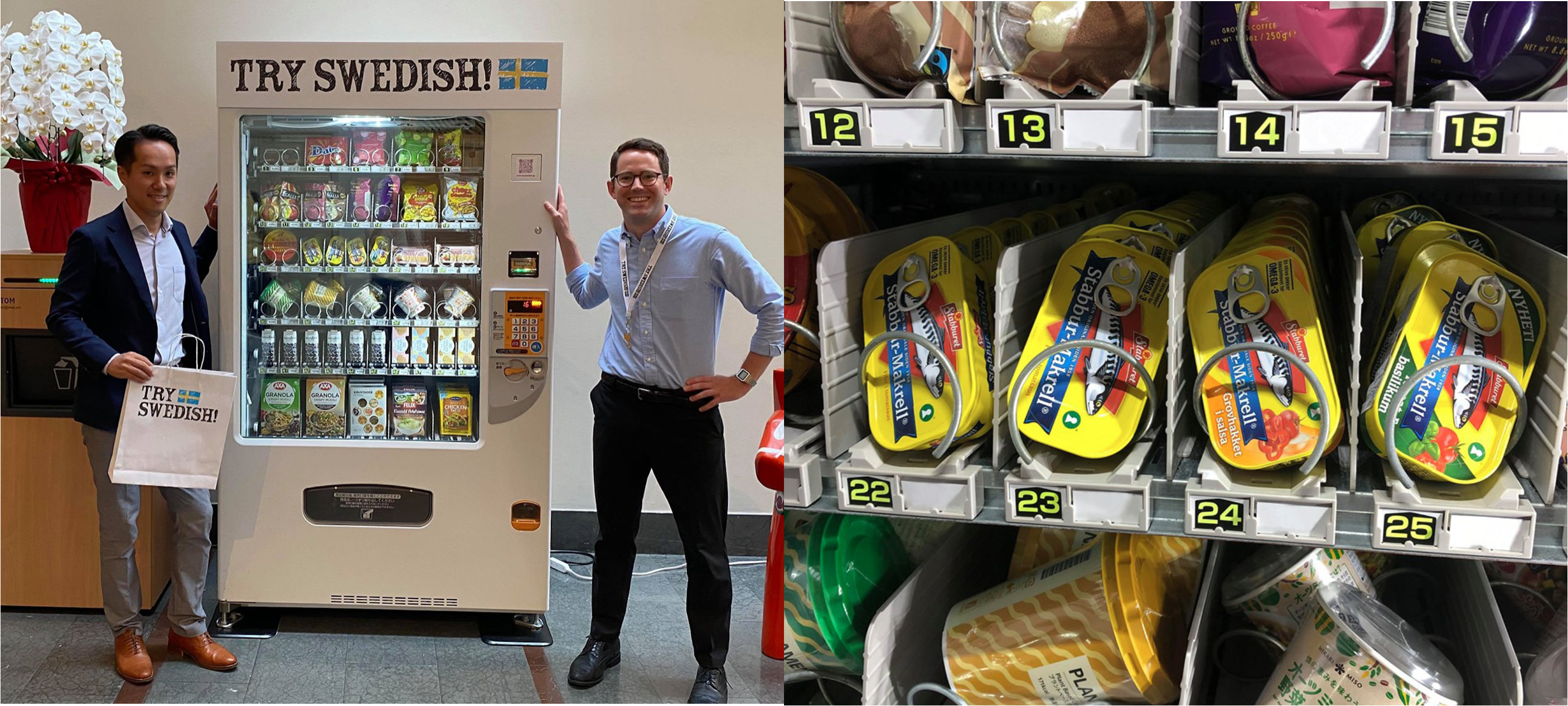 在日スウェーデン大使館に設置された「TRY SWEDISH!」自動販売機に、 スタブラのサバフィレ(110g) 3種類を置いていただけることになりました!!
